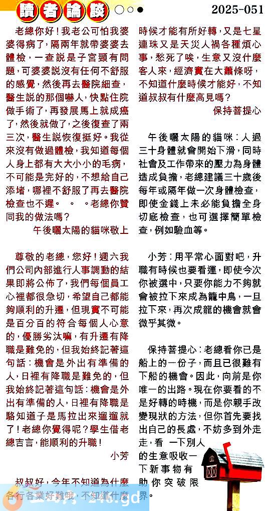 第零五一期讀者論談 1.老總你好!我老公可怕我婆婆得病了,隔兩年就帶婆婆去體檢,一查說是子宮頸有問題,可婆婆說沒有任何不舒服的感覺,然後再去醫院細查醫生說的那個嚇人,快點住院做手術了,再發展馬上就成癌了,然後就做了,之後復查了兩三次,醫生說恢復挺好。我從來沒有做過體檢,我知道每個人身上都有大大小小的毛病,不可能是完好的,不想給自己添堵,哪裡不舒服了再去醫院檢查也不遲。。。老總你賛同我的做法嗎?午後曬太陽的貓咪敬上 〖午後曬太陽的貓咪〗:人過三十身體就會開始下滑,同時社會及工作帶來的壓力為身體造成負擔,老總建議三十歲後每年或隔年做一次身體檢查,即使金錢上未必能負擔全身切底檢查,也可選擇簡單檢查,例如驗血等。 2.尊敬的老總您好!週六我們公司內部進行人事調動的結果即將公布了,我們每個員工心裡都很急切,希望自己都能夠順利的升遷,但現實不可能是百分百的符合每個人心意的,優勝劣汰嘛,有升遷有降職是難免的,但我始終記著這句話:機會是外出有準備的人,日裡有降職是難免的,但我始終記蓍這句話:機會是外出有準備的人,日裡有降職是駱知道子是馬拉出來遛遛就了!老總你覺得呢?學生借老總吉言,能順利的升職!小芳 〖小芳:〗:用平常心面對吧,升職有時候也要看運,即使今次你被選中,只要你能力不夠就會被拉下來成為籠中鳥,一旦拉下來,再次成龍的機會就會微乎其微。 3.叔叔好,今年不知道為什麼各行各業好難哦,不知道什麼時候才能有所好轉,又是七星連珠又是天災人禍各種煩心事,愁死了唉,生意又沒什麼客人來,經濟實在大蕭條呀不知道什麼時候才能好,不知道叔叔有什麼高見嗎?保持菩提心 〖保持菩提心〗:老總看你已是船上的一份子,而且已很難有下船的機會。因此,向前是你唯一的出路。現在你要看的不是好轉的時機,而是你親手改變現狀的方法,但你首先要找出自己的長處,不妨多到外走走,看一下别人的生意吸收一下新事物有助你突破限界。