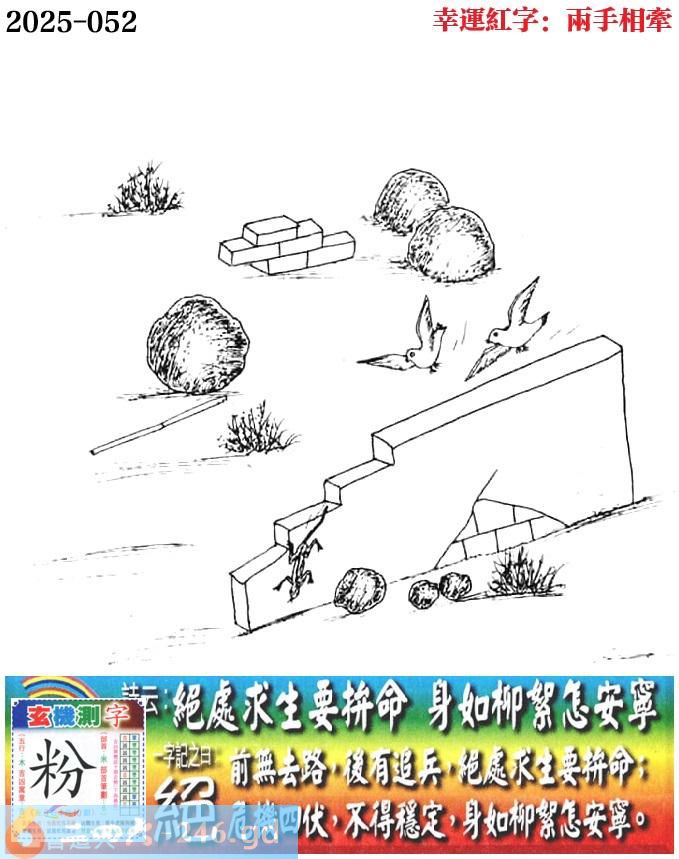 052期老版跑狗一字記之曰:【絕】 詩雲:絕處求生要拼命,身如柳絮怎安寧。 前無去路,後有追兵,絕處求生要拼命; 危機四伏,不得穩定,身如柳絮怎安寧。 玄機測字:《粉》