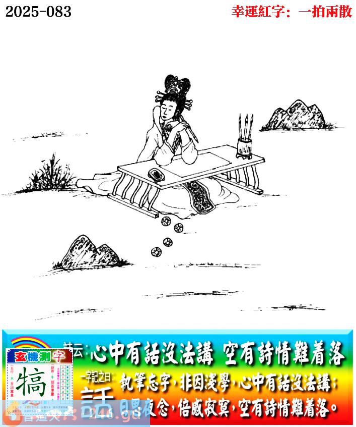 2025083期083期:老版跑狗玄機一字記之曰:【話】 詩云:心中有話沒法講,空有詩情難着落。