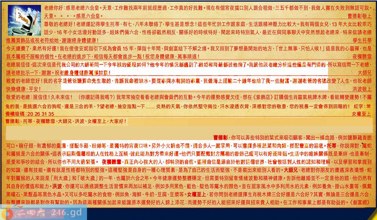 【6】.敬愛的老總:展信佳!久未來信!(你還記得我嗎?)我常常抽空看看老總與會員們的互動。今年的運勢感覺欠佳,想在《紫飾店》訂購個生肖靈氣桃牌木牌,看能轉變運勢!不屬兔的我,是挑選六合的狗呢,還是三合的羊、?望老總,抽空指點一下......炎熱的天氣,你依然堅守崗位,汗水浸透衣背,深感對您的敬意,您的税務一定會得到回報的!紅字:常備墳暗碼:20263135女權至上