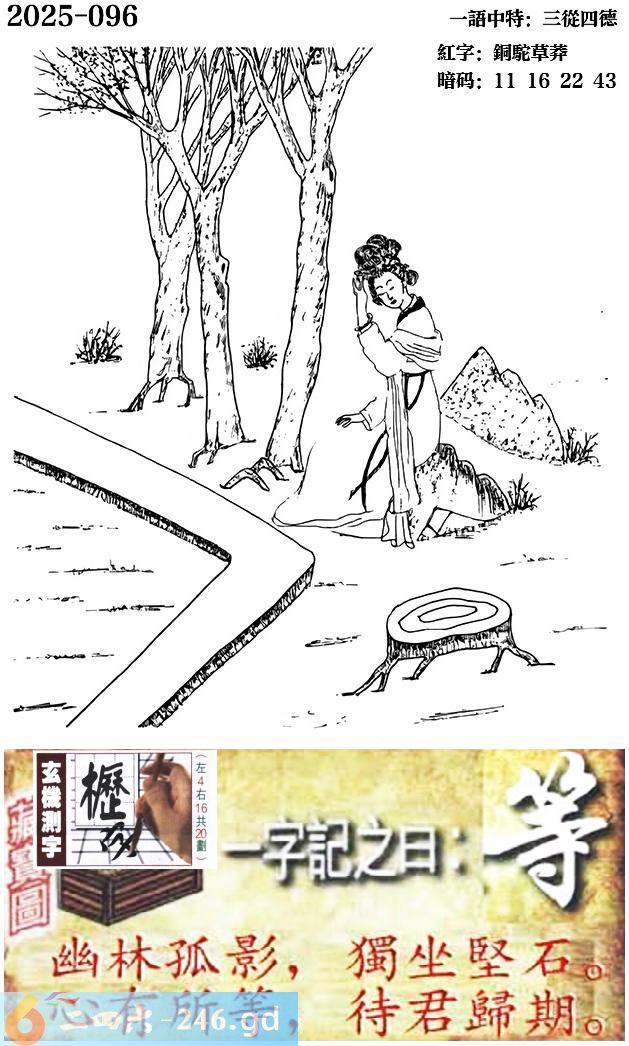 096期跑狗一字記之曰:【等】 幽林孤影,獨坐堅石。 心有所等,待君歸期。 玄機測字:《櫪》 一語中特:三從四德