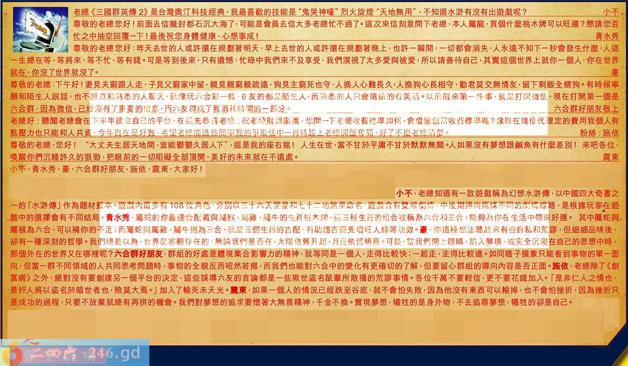 第101期《六合皇信箱文字版》10000%正確!!!正版二四六論壇*精心製作!!! 小不、青水秀、豪、六合群好朋友、施依、震東,大家好! 【1】.老總《三國群英傳2》是台灣奧汀科技經典,我最喜歡的技能是“鬼哭神嚎”烈火旋燈“天地無用”,不知道水滸有沒有出遊戲呢?小不 〖小不〗:老總知道有一款遊戲稱為幻想水滸傳,以中國四大奇書之的「水滸傳」作為題材藍本。遊戲內最多有108位角色,分別以三十六天罡星和七十二地煞星命名,遊戲含有雙線劇情,中後期通向兩條不同的劇情線路,是根據玩家在遊戲中的選擇會有不同結局。 【2】.尊敬的老總您好!前面去信幾封都石沉大海了,可能是會員去信太多老總忙不過了。這次來信刻意問下老總,本人屬龍,買個什麼桃木牌可以旺運?懇請您百忙之中抽空回覆一下!最後祝您身體健康、心想事成!青水秀 〖青水秀〗:屬蛇的你最適合配戴與屬猴、屬雞、屬牛的生肖桃木牌,這三種生肖的組合被稱為六合和三合,能夠為你在生活中帶來好運。其中屬蛇與屬猴為六合,可以補你的不足;而屬蛇與屬雞、屬牛則為三合,就是三個生肖的吉配,有助趨吉避究增旺人緣等功效。 【3】.尊敬的老總您好:昨天去世的人或許還在規劃著明天,早上去世的人或許還在規劃著晚上,也許一瞬間,一切都會消失,人永遠不知下一秒會發生什麼,人這一生總在等,等將來,等不忙,等有錢。可是等到後來,只有遺憾,忙碌中我們來不及享受,我們漠視了太多爱與被爱,所以請善待自己,其實這個世界上就你一個人,你在世界就在,你沒了世界就沒了。豪 〖豪〗:你這種想法聽起來有些自私和荒謬,但細細品味後,卻有一種深刻的哲學。我們總是以為,世界是客觀存在的,無論我們是否在太陽依舊升起、月亮依舊明亮。可是,當我們閉上眼睛,陷入夢境,或完全沉浸在自己的思想中時那個外在的世界又在哪裡呢? 【4】.尊敬的老總:下午好!妻見夫窮跟人走,子見父窮家中留,親見親窮親疏遠,狗見主窮死也守,人換人心難長久,人換狗心長相守,勸君莫交無情友,留下剩飯全餵狗。有時候寧願和陌生人說話,也不願意和熟悉的人聊天,就像玩六合彩一樣,6友的都是陌生人,而熟悉的人只會遠遠的看笑話。以前醒來第一件事:就是打開微信,現在打開第一個是六合群,因為微信,已經沒有了重要的信息而六友群成了我消耗時間的一部分。六合群好朋友敬上 〖六合群好朋友〗:群組的好處是體現集合影響力的精神,就等同是一個人,走得比較快;一起走,走得比較遠。如同瞎子摸象只能看到事物的單一面向,但當一群不同領域的人共同思考問題時,事物的全貌反而昭然若揭,而我們也能對六合中的變化有更確切的了解,但要留心群組的導向內容是否正面。 【5】.老總好:聽聞老總會在下半年建立自己的平台,在這先恭喜老總:祝老總財源廣進,想問一下老總收费標準如何會借鑒創富收費標準嗎?像現在幾位代理定的費用我個人有點壓力也只能和人共資,今年實在是好難,希望老總能透點簡單點的爭取估中一肖特趕上老總開盤奪筍,好了不擾老總清夢。粉絲:施依 〖施依〗:老總除了《創富網》之外,絕對沒有要創建另一個平台的決定,這些誤導六友的言論都是一些欺世盗名鼠輩所散播的荒謬事情。各位千萬不要輕信,更不要花錢加入。「是非仁人之情也,是奸人將以盗名於暗世者也,險莫大焉。」加入了輸死未天光。 【6】.尊敬的老總您好!“大丈夫生居天地間,豈能鬱鬱久居人下”,這是我的座右銘!人生在世,當不甘於平庸不甘於默默無聞。人如果沒有夢想跟鹹魚有什麼差別!來吧各位,喚醒你們沉睡許久的狠勁,把眼前的一切阻礙全部頂開,美好的未來就在不遠處。震東 〖震東〗:如果一個人的情況已經跌至谷底,就不會怕失敗,因為他沒有東西可以輸掉,也不會怕挫折,因為挫折只是成功的過程,只要不放棄就總有再拼的機會。我們對夢想的追求要懷著大無畏精神,千金不換。實現夢想,犧牲的是身外物,不去追尋萝想,犧牲的卻是自己。 紅字:彈空說嘴 暗码:13222729 [释义]犹言唱高调说空话。 [出处]《警世通言·庄子休鼓盆成大道》:“莫要弹空说嘴。假如不幸我庄周死后,你这般如花似玉的年纪,难道捱得过三年五载?”