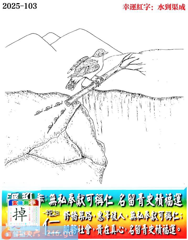 102期老版跑狗一字記之曰:【仁】 詩雲:無私奉獻可稱仁,名留青史積福運。 修橋築路,惠澤後人,無私奉獻可稱仁; 服務社會,貴在真心,名留青史積福運。 玄機測字:《掉》