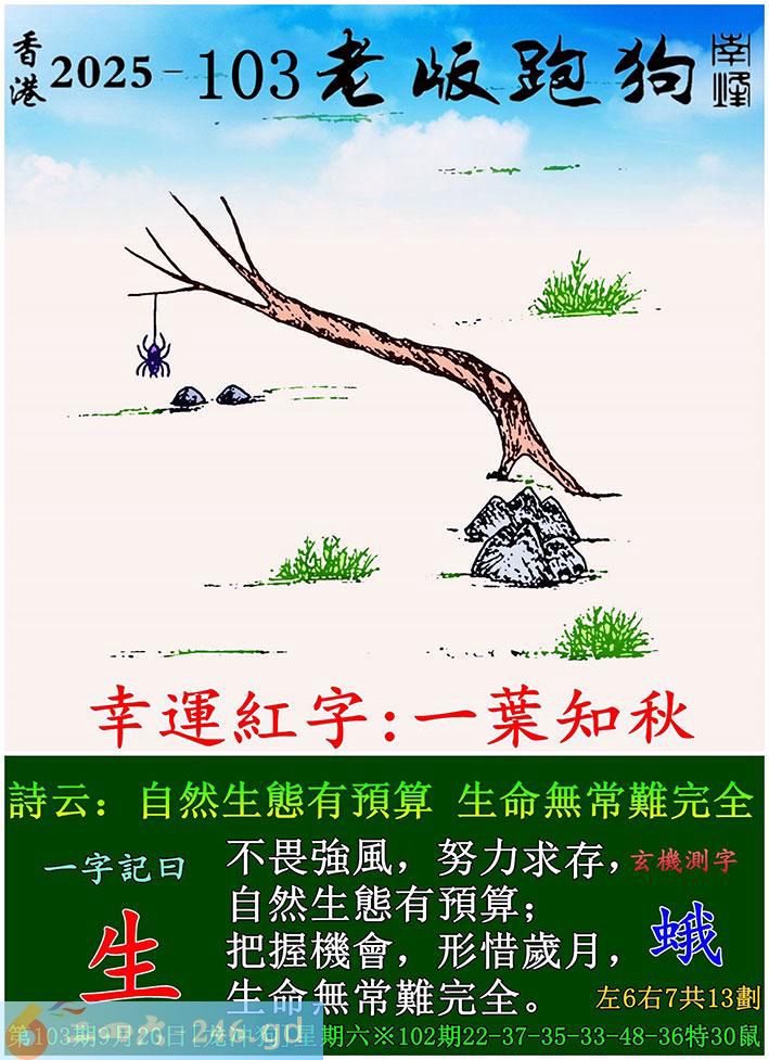 2025103期103期老版跑狗一字記之曰:【生】 詩雲:自然生悲有預算,生命五常難完全。