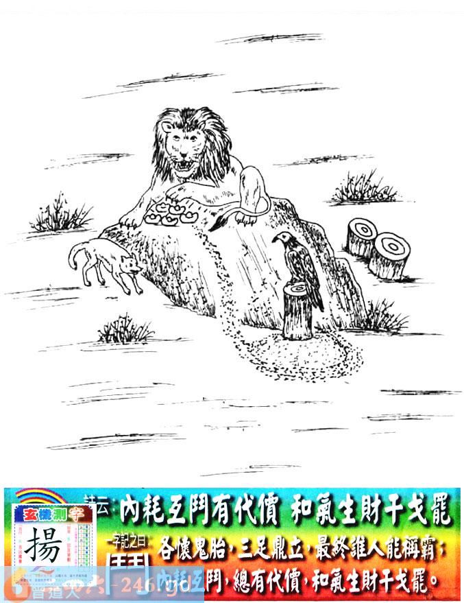 014期老版跑狗一字記之曰:【鬥】 詩雲:內耗互鬥有代價,和氣生財干戈罷。 各懷鬼胎,三足鼎立,最終誰人能稱霸; 內耗互鬥,總有代價,和氣生財干戈罷。 玄機測字:《揚》