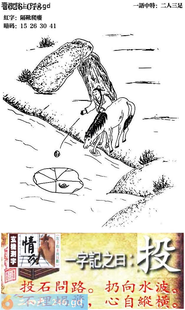 018期跑狗一字記之曰:【投】 投石問路。扔向水波。 不理蝸驚,心自縱橫。 玄機測字:《情》 一語中特:二人三足