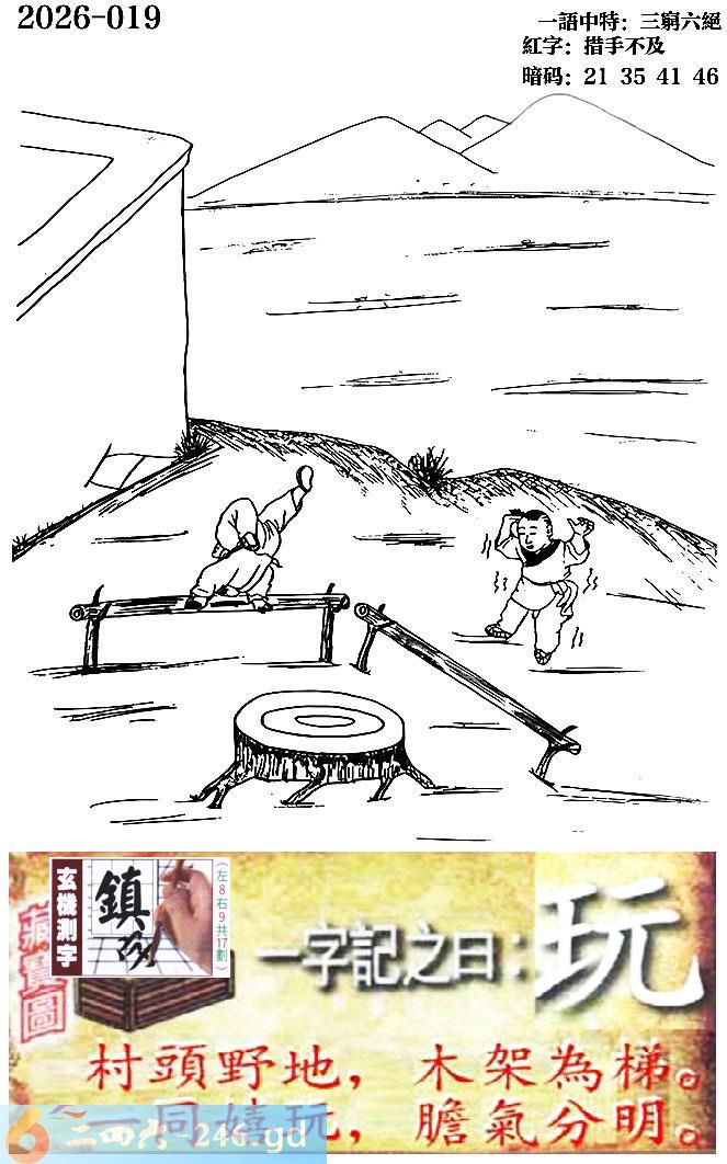 019期跑狗一字記之曰:【玩】 村頭野地,木架為梯。 壹同嬉玩,膽氣分明。