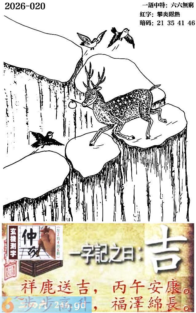 020期跑狗一字記之曰:【吉】 祥鹿送吉,丙午安康。 步步高升,福澤綿長。
