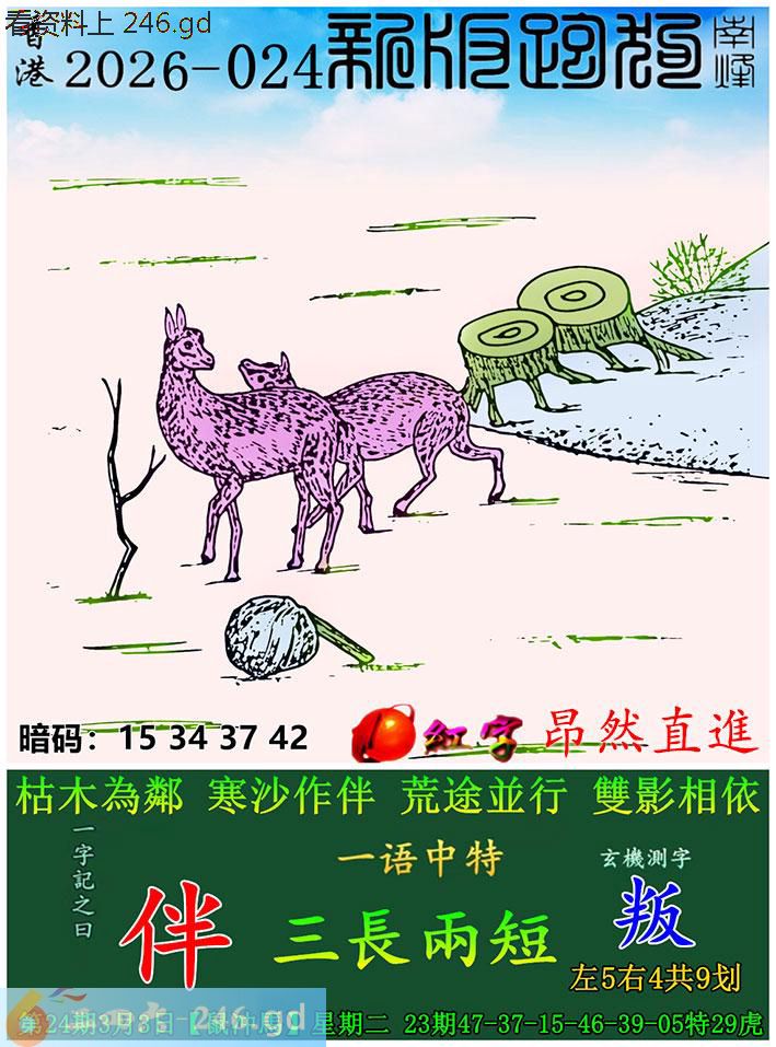024期跑狗一字記之曰:【伴】 枯木為鄰,寒沙作伴。 荒途並行,雙影相依。 玄機測字:《叛》 一語中特:三長兩短