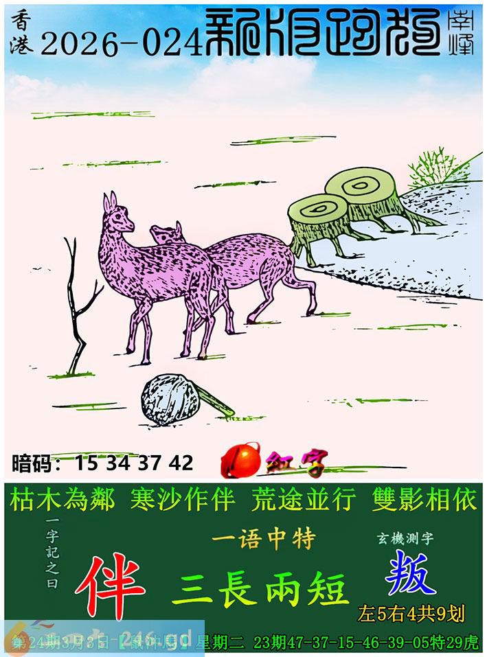 24期跑狗一字記之曰:【伴】 枯木為鄰,寒沙作伴。 荒途並行,雙影相依。 玄機測字:《叛》 一語中特:三長兩短