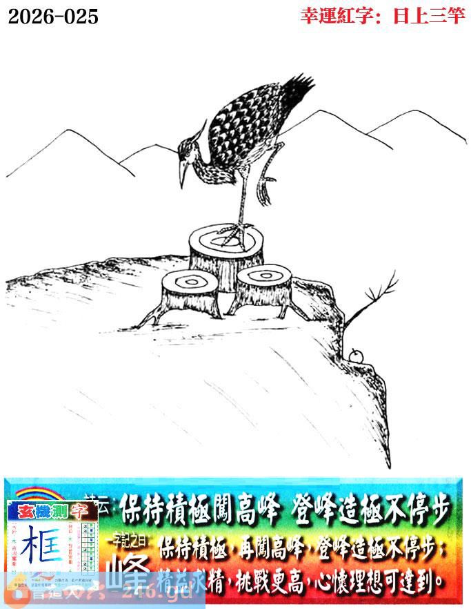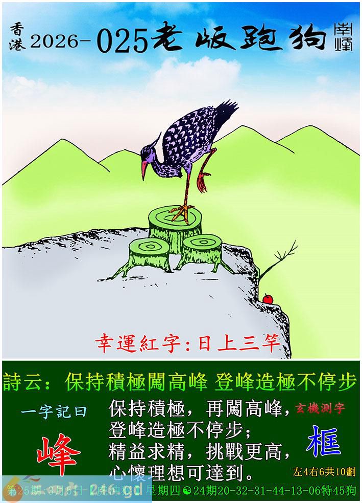 025期老版跑狗一字記之曰:【峰】 詩雲:保持積極闖高峰,登峰造極不停步。 保持積極,再闖高峰,登峰造極不停步; 精益求精,挑戰更高,心懷理想可達到。 玄機測字:《框》