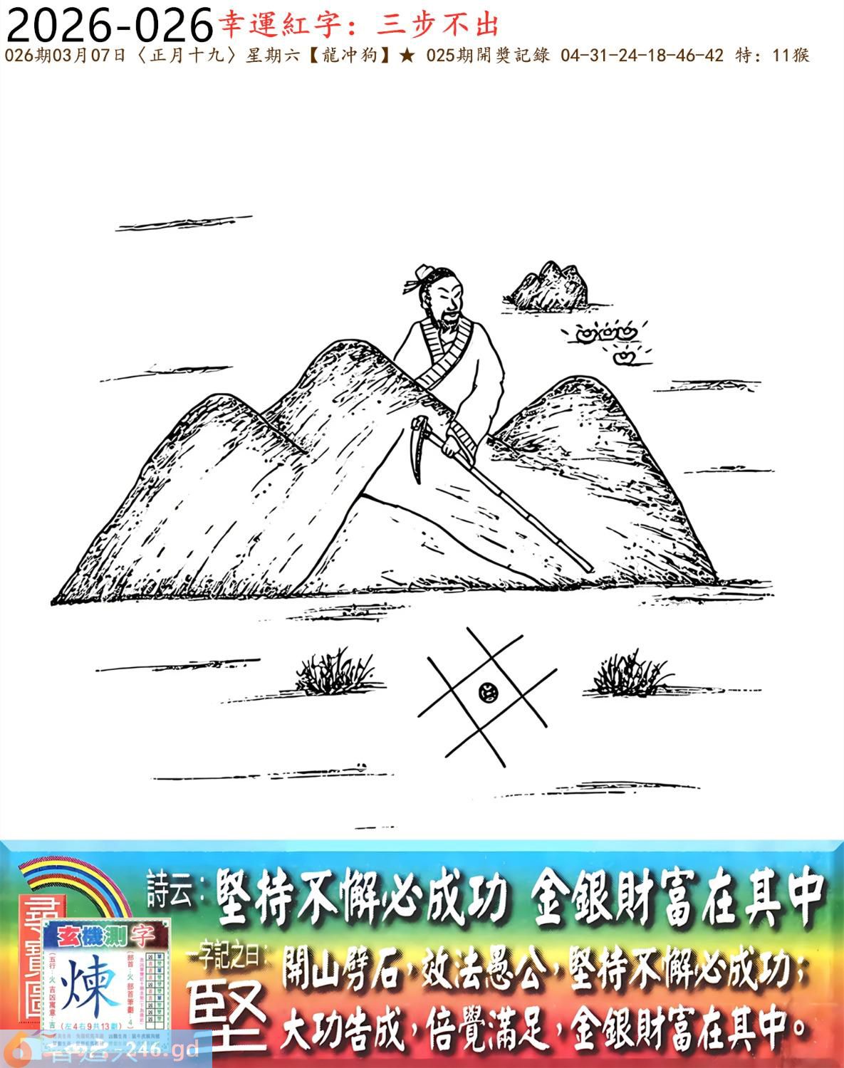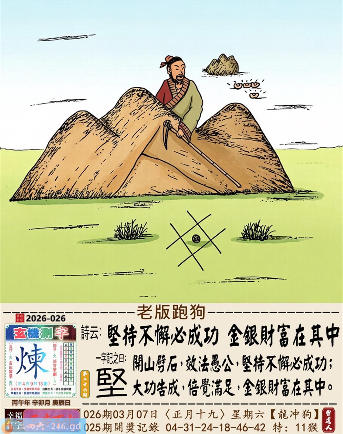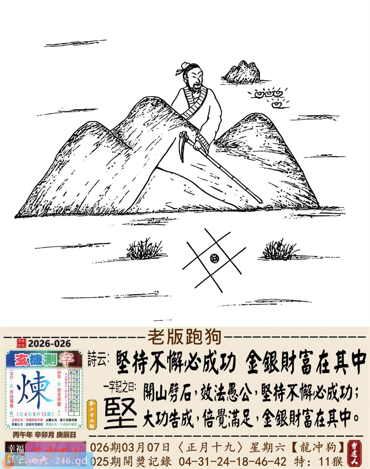 本帖最后由小歪于2026-3-809:25编辑 2026年3月7日星期六白腊金龙日冲狗 026期:老版跑狗玄机一字記之曰:【堅】 詩云:堅持不懈必成功,金銀財富在其中。 開山劈石,效法愚公,堅持不懈必成功; 大功告成,倍覺滿足,金銀財富在其中。 玄機測字:《煉》 密圖詩:打開大門迎財神 記:落入平川斷其尾 特碼大小單雙句:一腳登天是神仙 今期必中:貂蟬 026期:特碼歇后語 虾子过河-----谦(牵)虚(须) 026期正版四字梅花诗:浴火重生。 026期火车头:烧伤猪。诗:虎死猪伤,二三两数取合数。 026期香港第一手欲钱料:杂七杂八。 026期曾道人说:“猪?” 026期另版四字梅花诗:名公巨人。 026期香港第一手欲钱料:欲钱买思维迟钝的动物。 026期曾道人说:“七侠五仪” 026期二字经:唤醒。 026期:紅字:【力窮思變】 026期:暗码:【01333640】 026期:一語中特:【一五一十】 發財玄機圖:嗅聞舔鼻躺臥休息圖中明牛藍綠 026期:藏寶圖 新:谁家合榭当年筑 老:此日陆军同驻马 禁:牛禁:0尾玄機字《政》 2026年026期【生活幽默】版 〖夫妻之禮是何人所製〗 一女子要出嫁,對于那夫妻之事十分恐慌,哭着問嫂子:"夫妻之禮是何人所制?"嫂子説:"周公。" 女子大罵周公不已。 婚後滿一月,女子回娘家,問嫂子:"周公何在?" 嫂子説:"他是古人,你找他做什?" 女子説:"我要做雙鞋答謝他呀。"