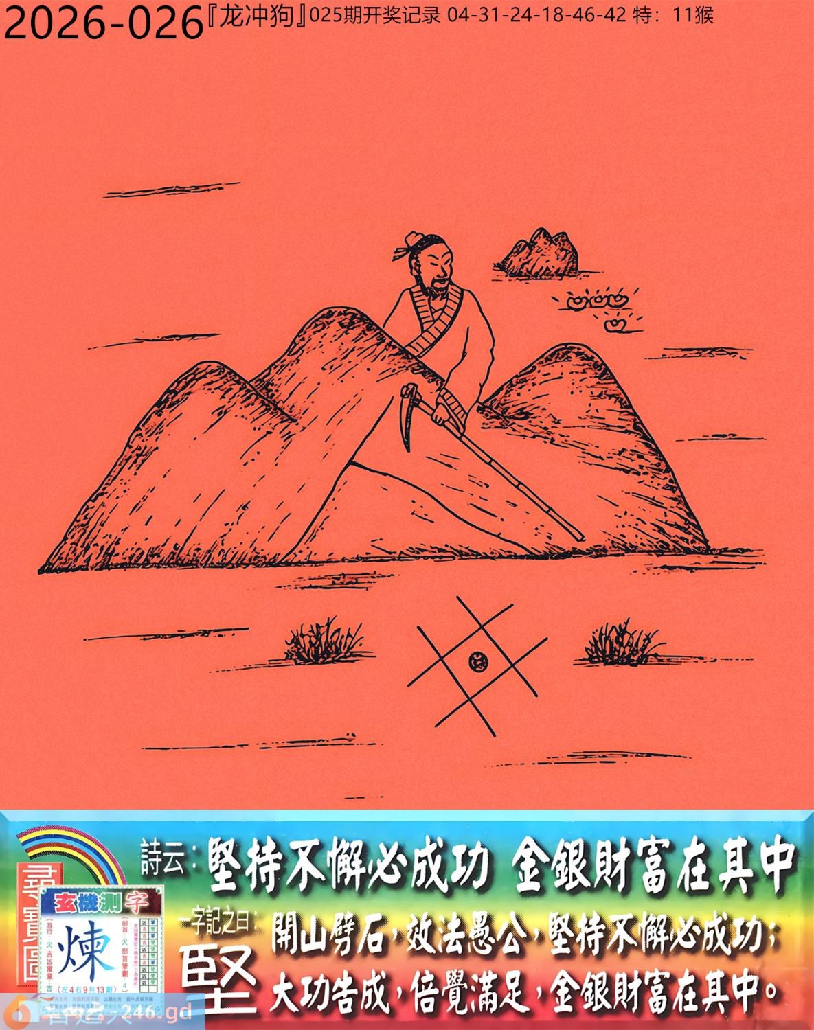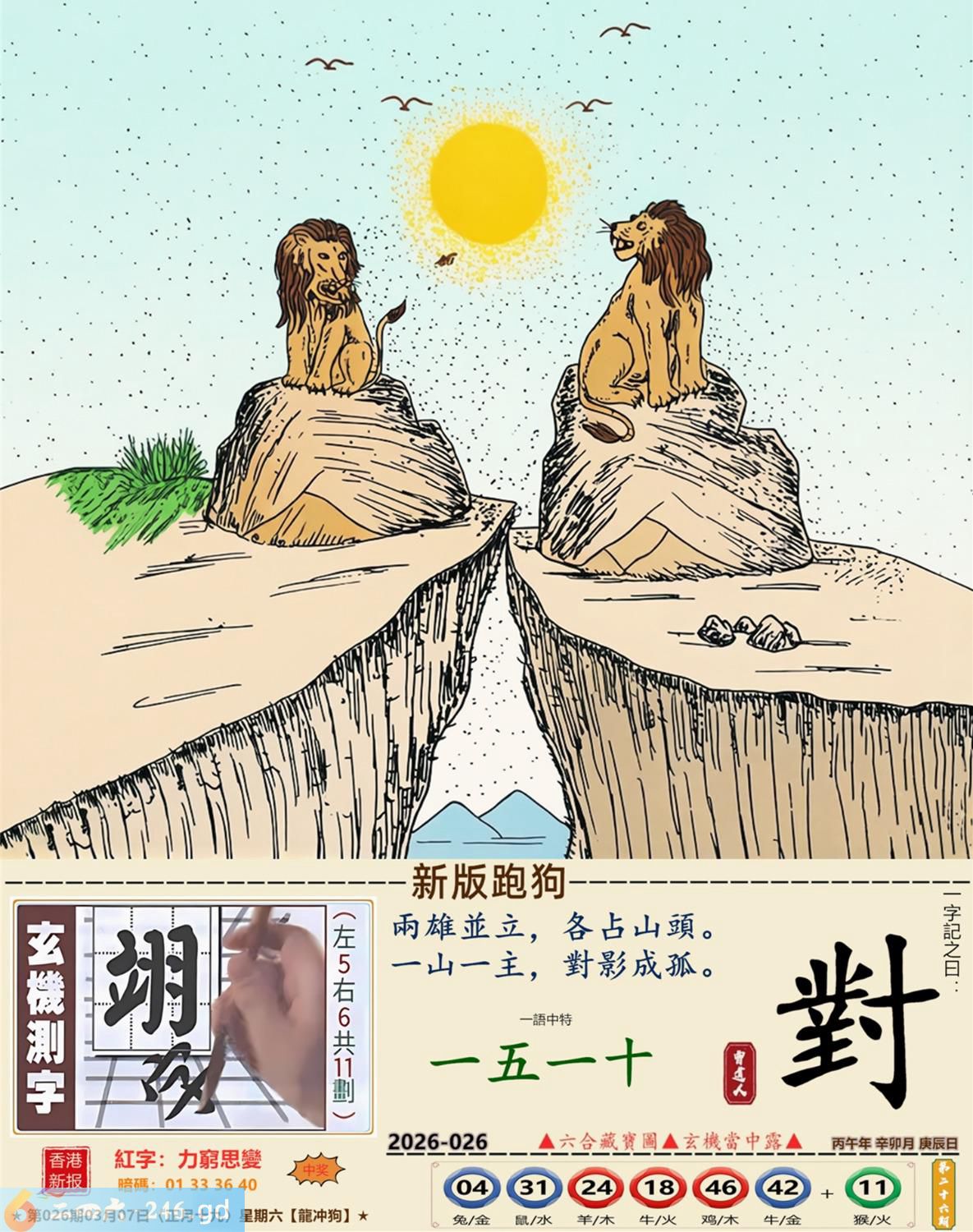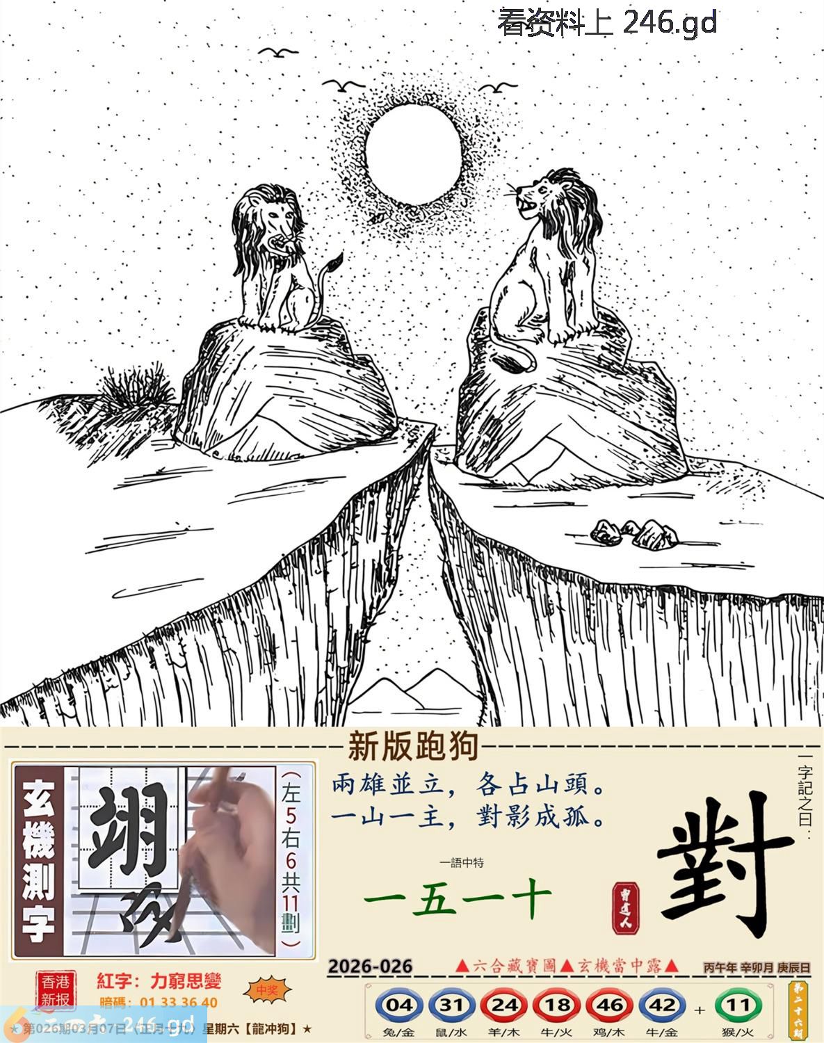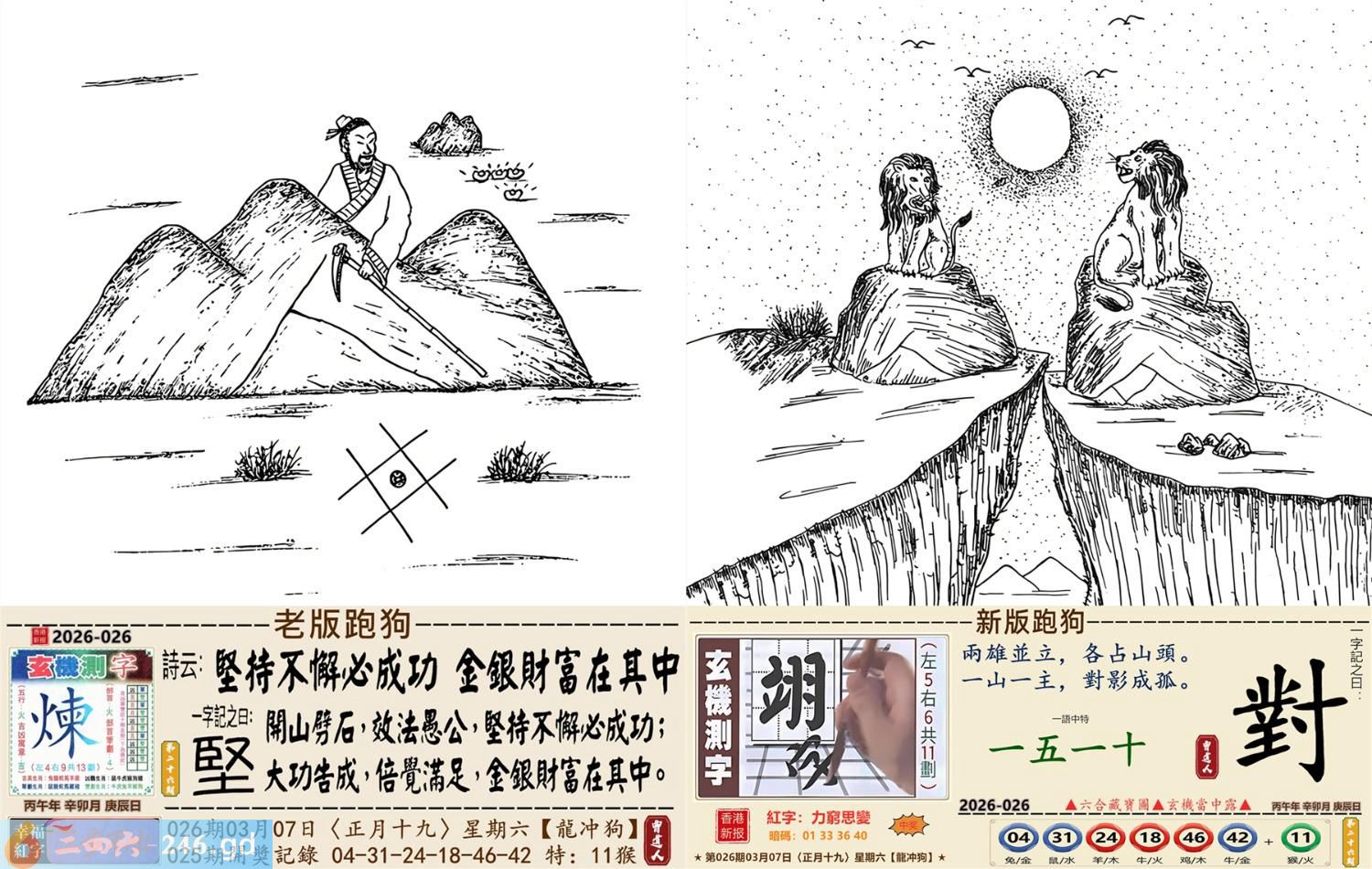 本帖最后由小歪于2026-3-809:25编辑 2026年3月7日星期六白腊金龙日冲狗 026期:老版跑狗玄机一字記之曰:【堅】 詩云:堅持不懈必成功,金銀財富在其中。 開山劈石,效法愚公,堅持不懈必成功; 大功告成,倍覺滿足,金銀財富在其中。 玄機測字:《煉》 密圖詩:打開大門迎財神 記:落入平川斷其尾 特碼大小單雙句:一腳登天是神仙 今期必中:貂蟬 026期:特碼歇后語 虾子过河-----谦(牵)虚(须) 026期正版四字梅花诗:浴火重生。 026期火车头:烧伤猪。诗:虎死猪伤,二三两数取合数。 026期香港第一手欲钱料:杂七杂八。 026期曾道人说:“猪?” 026期另版四字梅花诗:名公巨人。 026期香港第一手欲钱料:欲钱买思维迟钝的动物。 026期曾道人说:“七侠五仪” 026期二字经:唤醒。 026期:紅字:【力窮思變】 026期:暗码:【01333640】 026期:一語中特:【一五一十】 發財玄機圖:嗅聞舔鼻躺臥休息圖中明牛藍綠 026期:藏寶圖 新:谁家合榭当年筑 老:此日陆军同驻马 禁:牛禁:0尾玄機字《政》 2026年026期【生活幽默】版 〖夫妻之禮是何人所製〗 一女子要出嫁,對于那夫妻之事十分恐慌,哭着問嫂子:"夫妻之禮是何人所制?"嫂子説:"周公。" 女子大罵周公不已。 婚後滿一月,女子回娘家,問嫂子:"周公何在?" 嫂子説:"他是古人,你找他做什?" 女子説:"我要做雙鞋答謝他呀。"