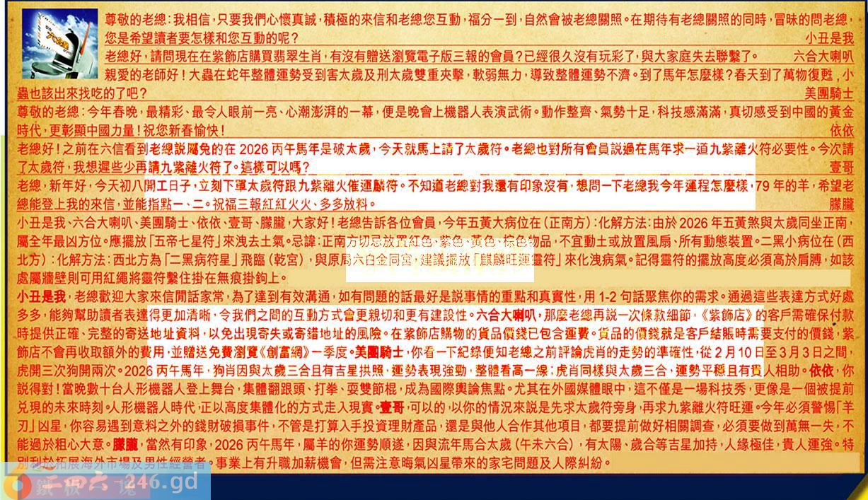 【6】.老總,新年好,今天初八開工日子,立刻下軍太歲符跟九紫離火催運麟符。不知道老總對我還有印象沒有,想問一下老總我今年運程怎麼様,79年的羊,希望老總能登上我的來信,並能指點一、二。祝福三報紅紅火火、多多放料。朦朧