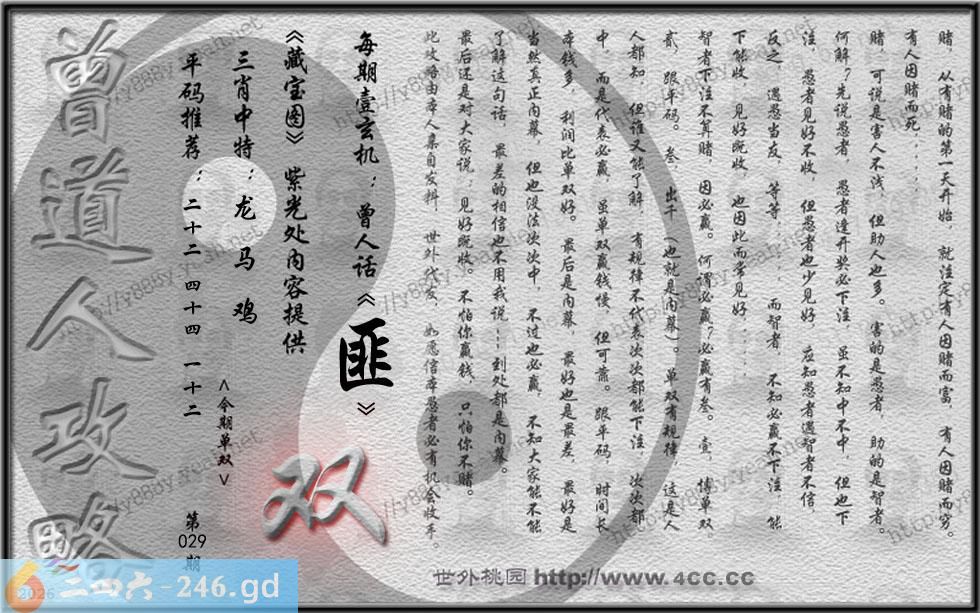 029期藏寶圖 新:江上年年小雪迟 老:柳丝巷陌黄昏月 禁:虎禁:4尾玄機字:《匪》