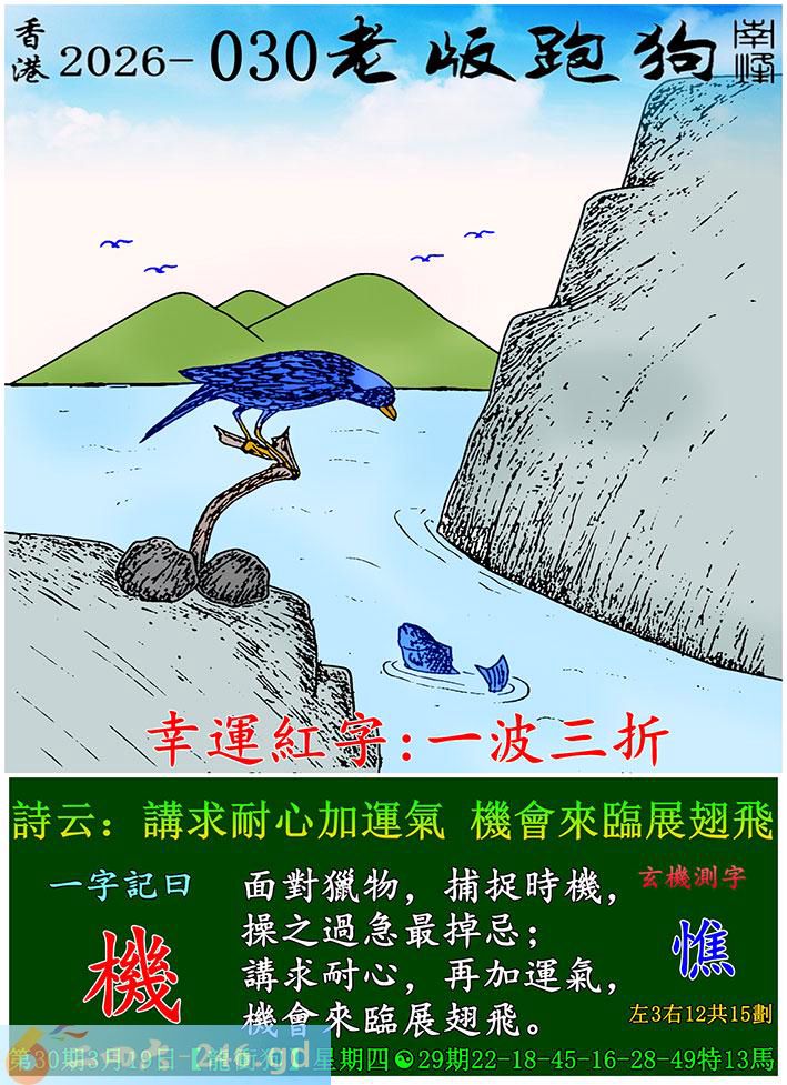 030期老版跑狗一字記之曰:【機】 詩雲:講求耐心加運氣,機會來臨展翅飛。