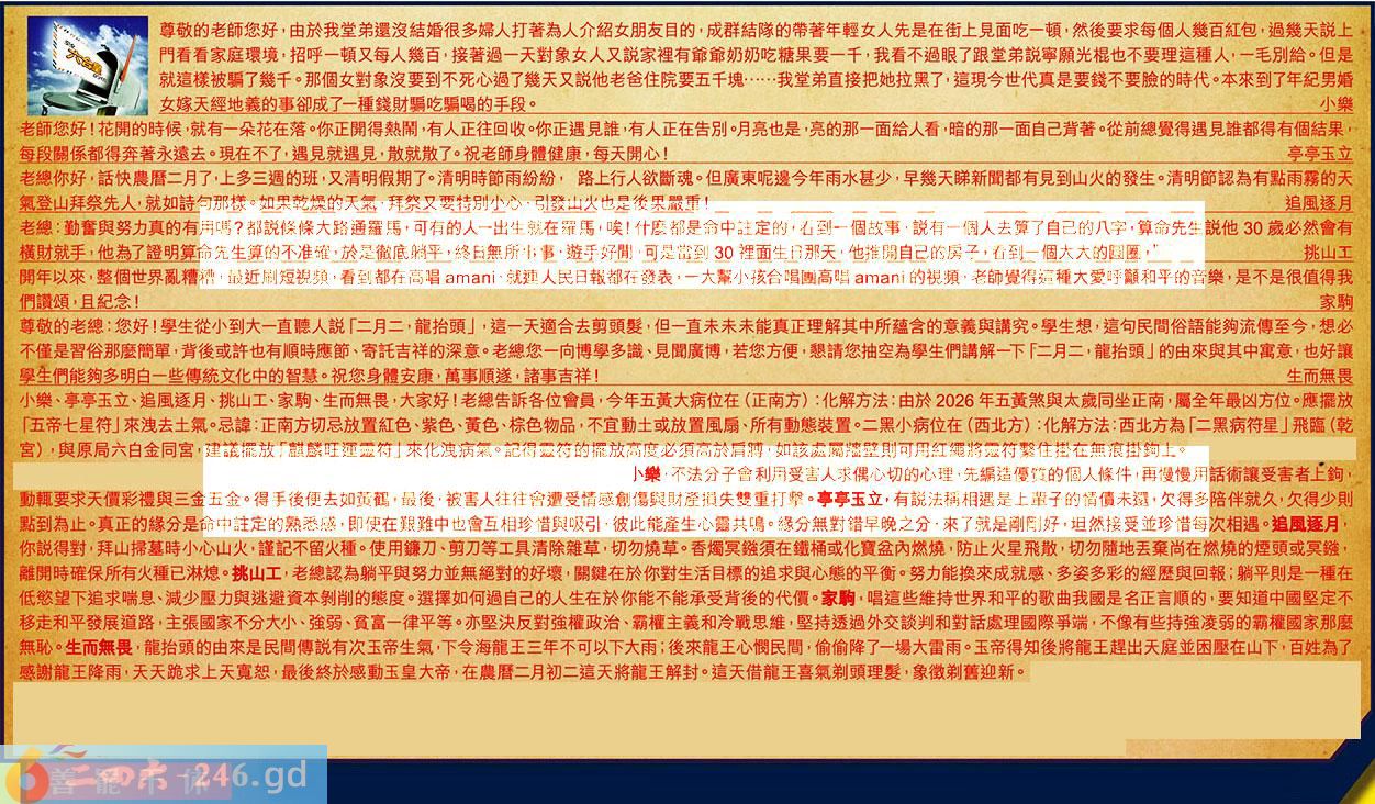 第041期《六合皇信箱文字版》10000%正確!!! 小樂、亭亭玉立、追風逐月、挑山工、家駒、生而無畏,大家好!老總告訴各位會員,今年五黃大病位在((正南方):化解方法:由於2026年五黃煞與太歲同坐正南,屬全年最凶方位。應擺放「五帝七星符」來洩去土氣。忌諱:正南方切忌放置紅色、紫色、黄色、棕色物品,不宜動土或放置風扇、所有動態裝置。二黑小病位在(西北方):化解方法:西北方為「二黑病符星」飛臨(乾宮),與原局六白金同宮,建議擺放「麒麟旺運靈符」來化洩病氣。記得靈符的擺放高度必須高於肩膊,如該處屬牆壁則可用紅繩將靈符繫住掛在無痕掛鉤上。 【1】.尊敬的老師您好,由於我堂弟還沒結婚很多婦人打著為人介紹女朋友目的,成群結隊的帶著年輕女人先是在街上見面吃一頓,然後要求每個人幾百紅包,過幾天説上,門看看家庭環境,招呼一頓又每人幾百,接著過一天對象女人又説家裡有爺爺奶奶吃糖果要一千,我看不過眼了跟堂弟説寧願光棍也不要理這種人,一毛別給。但是就這樣被騙了幾千。那個女對象沒要到不死心過了幾天又説他老爸住院要五千......我堂弟直接把她拉黑了,這現今世代真是要錢不要臉的時代。本來到了年紀男婚女嫁天經地義的事卻成了一種錢財騙吃騙喝的手段。小樂 〖小樂〗:不法分子會利用受害人求偶心切的心理,先編造優質的個人條件再慢慢用話術讓受害者上鉤,動輒要求天價彩禮與三金五金。得手後便去如黄鶴,最後,被害人往往會遭受情感創傷與財產損失雙重打擊。 【2】.老師您好!花開的時候就有一朵花在落。你正開得熱鬧,有人正往回收。你正遇見誰,有人正在告別明月亮也是,亮的那一面給人看,暗的那一面自己背著。從前總覺得遇見誰都得有個結果,每段關係都得奔著永遠去。現在不了,遇見就遇見,散就散了。祝老師身體健康,每天開心!亭亭玉立 〖亭亭玉立〗:有説法稱相遇是上輩子的情债未選,欠得多陪伴就久,欠得少則點到為止。真正的緣分是命中証定的熟悉感,即使在艱難中也會互相珍惜與吸引,彼此能產生心靈共鳴。緣分無對錯早晚之分,來了就是剛剛好,坦然接受並珍惜每次相遇。 【3】.老總你好,話快農暦二月了,上多三週的班,又清明假期了。清明時節雨紛紛,路上行人欲斷魂。但廣東呢邊今年雨水甚少,早幾天睇新聞都有見到山火的發生。清明節認為有點雨霧的天氣登山拜祭先人,就如詩句那樣。如果乾燥的天氣,拜祭又要特别別小心,引發山火也是後果嚴重!追風逐月 〖追風逐月〗:你説得對,拜山掃墓時小心山火,謹記不留火種。使用鎌刀、剪刀等工具清除雜草,切勿燒草。香燭冥雛須在鐵桶或化寶盆內燃燒,防止火星飛散,切勿随地丢棄尚在燃燒的煙頭或冥鏃離開時確保所有火種已淋熄。 【4】.老總:勤奮與努力真的有用嗎?都説條條大路通罹馬可有的人一出生就在羅馬,唉!什麼都是命中注定的,看到一個故事,説有一個人去算了自己的八字,算命先生説他30歲必然會有横財就手,他為了證明算命先生算的不准確,於是徽底躺平,終日無所事事遊手好閒,可是當到30裡面生日那天,他推開自己的房子,看到一個大大的圆圈,"挑山工 〖挑山工〗:老總認為躺平與努力並無絕對的好壞,關鍵在於你對生活目標的追求與心態的平衡。努力能換來成就感、多姿多彩的經歷與回報;躺平則是一種在低慾望下追求喘息、減少壓力與逃避資本剥削的態度。選擇如何過自己的人生在於你能不能承受背後的代價。 【5】.開年以來,整個世界亂糟糟,最近刷短視频看到都在高唱,就速人民日報都在發表,一大麗小孩合唱國高唱的視频,老師覺得這秫大愛呼顧和平的音樂,是不是很值得我們護頌,且紀念!家駒 〖家駒〗:唱這些維持世界和平的歌曲我國是名正言順的,要知道中國堅定不移走和平發展道路,主張國家不分大小、強弱、貧富一律平等。亦堅決反對強權政治、霸權主義和冷戰思維,堅持透過外交談判和對話處理國際爭端,不像有些持強凌弱的霸權國家那麼無恥。 【6】.尊敬的老總:您好!學生從小到大一直聽人説「二月二,龍抬頭」,這一天適合去剪頭髪,但一直未未未能真正理解其中所蕴舍的意義與講究。學生想,這句民間俗語能夠流傅至今,想必不僅是習俗那麼簡單,背後或許也有順時應節、寄託吉祥的深意。老總您一向博學多識、見聞廣博,若您方便,懇請您抽空為學生們講解一下「月二,龍抬頭」的由來與其中寓意,也好讓學生們能夠多明白一些傳統文化中的智慧。祝您身體安康,萬事順遂,諸事吉祥!生而無畏 〖生而無畏〗:龍抬頭的由來是民間傳説有次玉帝生氣,下令海龍王三年不可以下大雨;後來龍王心憫民間,偷偷降了一場大雷雨。玉帝得知後將龍王趕出天庭並困壓在山下,百姓為了感謝龍王降雨,天天跪求上天寬恕,最後終於感動玉皇大帝,在農暦二月初二這天將龍王解封。這天借龍王喜氣剃頭理髪,象徵剃舊迎新。 紅字:善罷甘休 暗码:05164849 [释义]轻易地了结纠纷,心甘情愿地停止再闹。 [出处]清·曹雪芹《红楼梦》:“奶奶就是让着他,他见奶奶比他标致,又比他得人心儿,他就善罢甘休了?”
