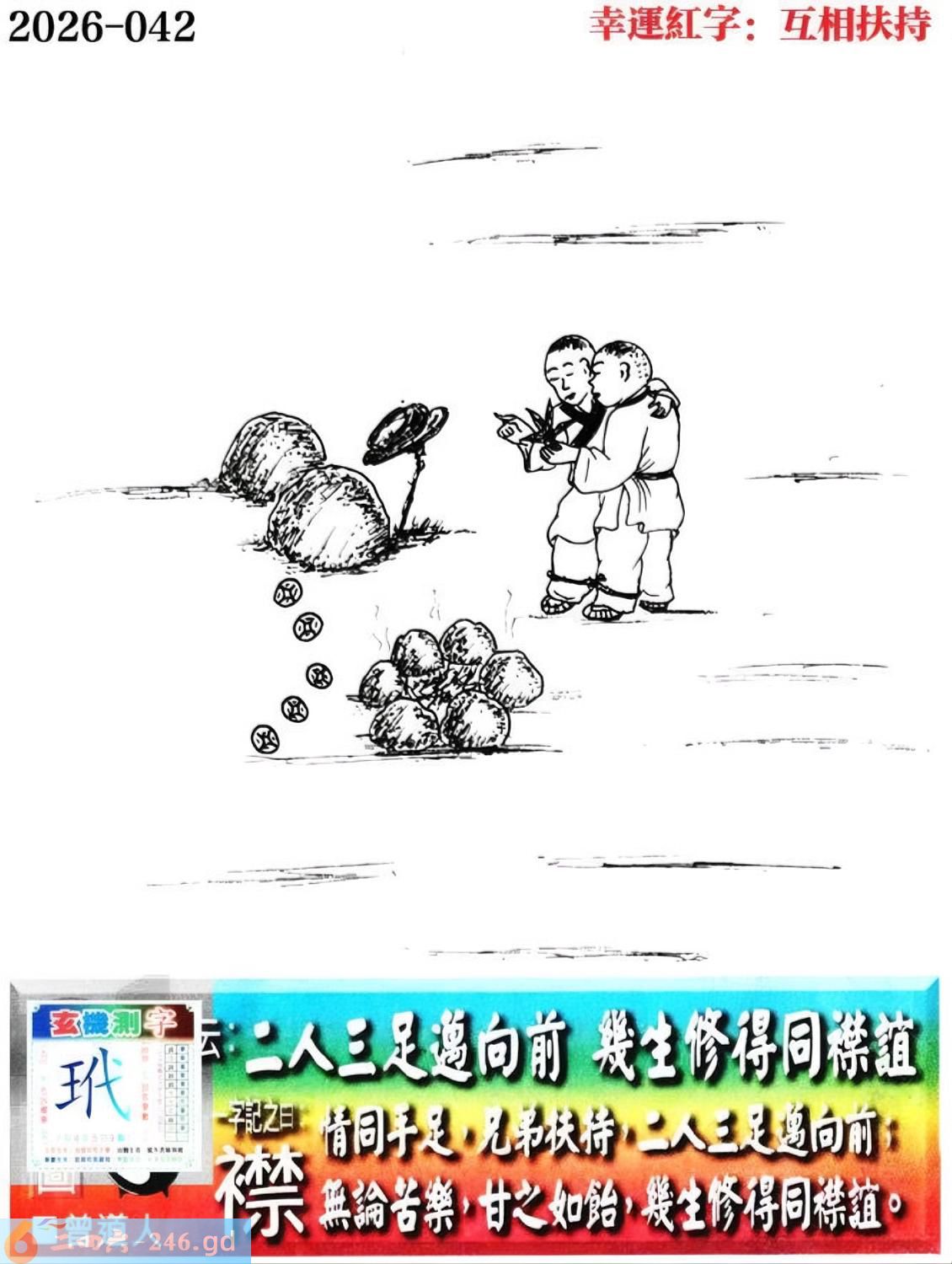 本帖最后由小歪于2026-4-1719:41编辑 2026年4月18日三月初二星期六大海水狗日沖龍 042期:老版跑狗玄机一字記之曰:【襟】 詩云:二人三足邁向前,幾生修得同襟誼。 情同手足,兄弟扶持,二人三足邁向前; 無論苦樂,甘之如飴,幾生修得同襟誼。 玄機測字:《玳》 密圖詩:酒足飯飽去按摩 記:同桌對坐賽象棋 特碼大小單雙句:一窩鳥蛋有六個 今期必中:趙雲 042期:特碼歇后語 懒汉过年-----一年不如一年 042期正版四字梅花诗:瞬息万变。 042期火车头:烧伤兔。诗:羊死猴伤,半岭天风一九三。 042期香港第一手欲钱料:添砖加瓦? 042期曾道人说:“要钱去找1995年第35期开奖结果?” 搬砖 042期另版四字梅花诗:大年初三。 042期香港第一手欲钱料:欲钱看今年元旦的日子。 042期曾道人说:“为什么新年大家都要放鞭炮”? 042期:二字经:绿红。 042期:太太是特码 042期智力金壤:洗耳恭听 042期信箱紅字:【生發未燥】 042期暗码:【05164849】 042期一語中特:【五光十色】 發財玄機圖:口吐烈焰威猛迅捷圖中明龍紅綠 042期:藏寶圖 新:曾捧瀛洲札翰来 老:白草黄榆陆拾秋 禁:鸡禁:0尾玄机字《嘉》 2026年042期【生活幽默】版 〖郁悶的小伙子〗 在飛機上,一個小伙子和一位老人并排坐着。小伙子:"請問,現在幾點鐘?" 老年人:"我不能告訴你,我要是告訴你現在幾點鐘,你就會向我表示感謝。這樣,話匣子一打開,就不容易收場了。再過一會兒,我們就會一道下飛機。在機場上,你又會請我進咖啡館,我也會請你到我家去做客,我家裹有一個小女兒,她長得很漂亮。于是你就會愛上了她,她也會爱上你,于是你們就會决定结婚。可是,你要知道,我决不會把女兒嫁給一個連手表都没有的窮光蛋。"