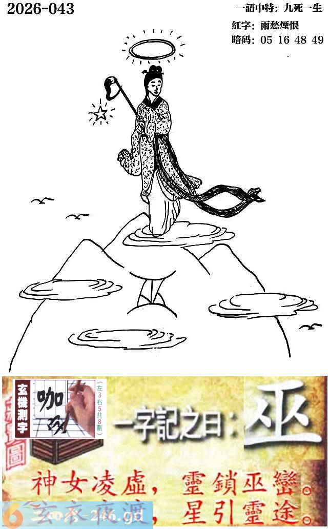 043期跑狗一字記之曰:【巫】 神女淩虛,靈鎖巫巒。 玄衣夜渡,星引靈途。 玄機測字:《咖》 一語中特:九死一生