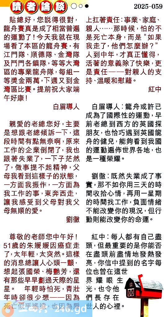 1.貼總好,您說得很對,龍舟賽真是成了相當普遍的運動了!今天我就在現場看了本區的龍舟賽,有江門隊、順德隊、金灣隊及鬥門各鎮隊,等等大灣區的專業龍舟隊,每組一等獎金兩萬,下週又到金灣區比賽。提前祝大家端午安康!白眉導人