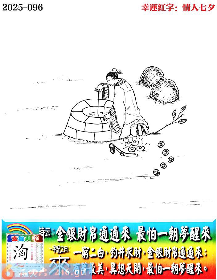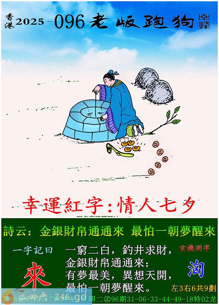 096期老版跑狗一字記之曰:【來】 詩雲:金銀財帛通通來,最怕一朝夢醒來。 一窮二白,釣井求財,金銀財帛通通來; 有夢最美,異想天開,最怕一朝夢醒來。 玄機測字:《洶》