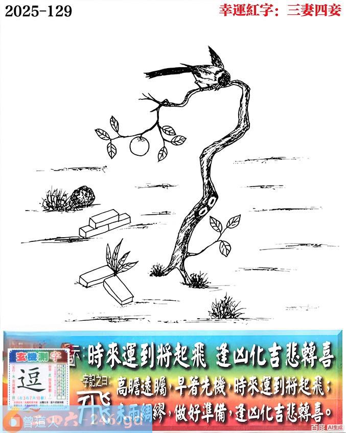129期老版跑狗一字記之曰:【飛】 詩雲:時來運到將起飛,逢凶化吉悲轉喜。 高瞻遠矚,早著先機,時來運到將起飛; 未雨綢繆,做好準備,逢凶化吉悲轉喜。 玄機測字:《逗》