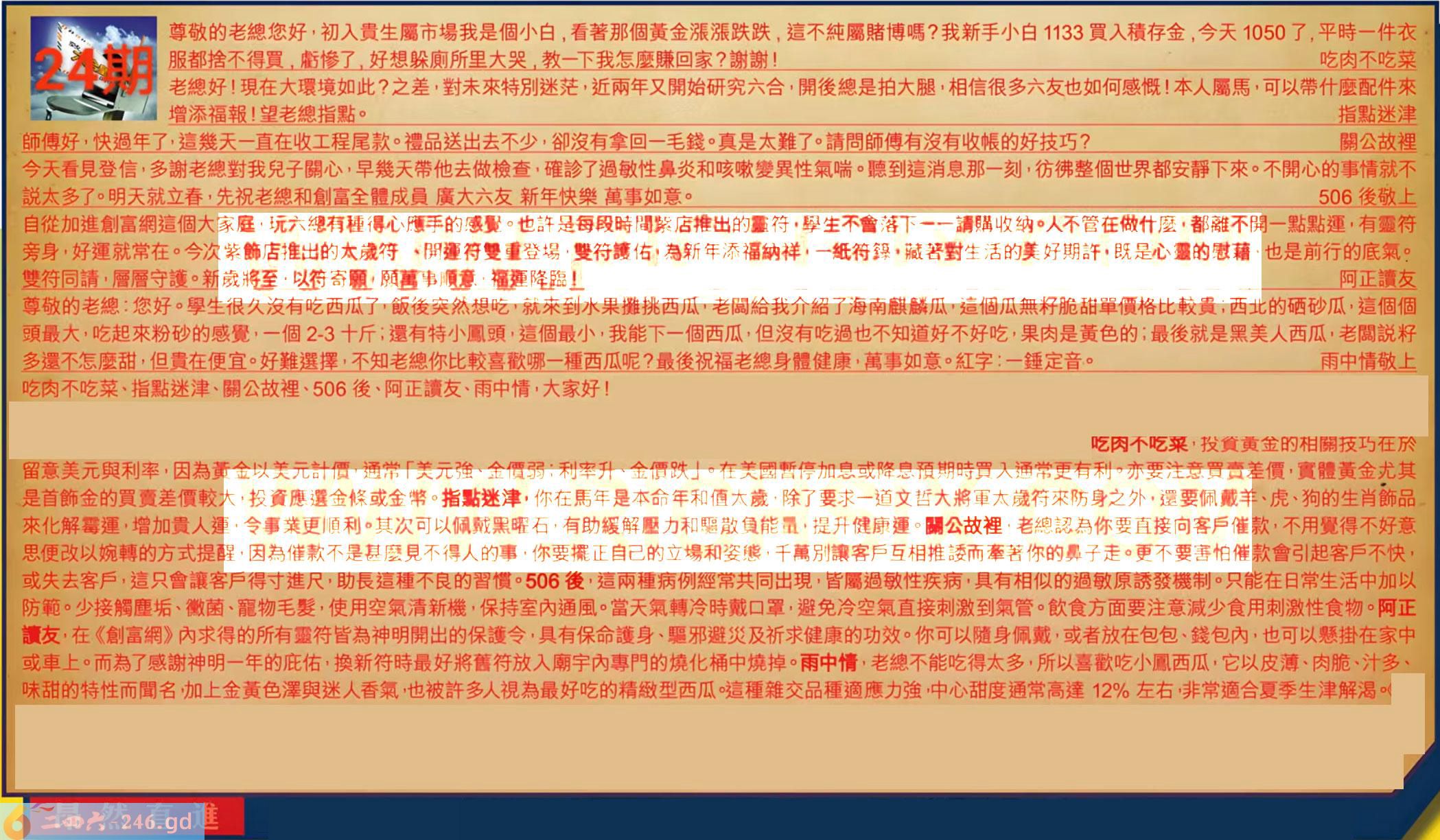 第024期《六合皇信箱文字版》10000%正確!!!正版二四六論壇*精心製作!!! 吃肉不吃菜、指點迷津、關公故裡、506後、阿正讀友、雨中情,大家好! 【1】.尊敬的老總您好,初入貴生屬市場我是個小白,看著那個黃金漲漲跌跌,這不純屬賭博嗎?我新手小白1133買入積存金,今天1050了,平時一件衣服都捨不得買,虧惨了,好想躲厕所里大哭,教一下我怎麼赚回家?謝谢謝!吃肉不吃菜 〖吃肉不吃菜〗:投資黄金的相關技巧在於留意美元與利率,因為黃金以美元計價,通常「美元強、金價弱;利率升、金價跌」。在美國暫停加息或降息預期時買入通常更有利。亦要注意買賣差價,實體黄金尤其是首飾金的買賣差價較大,投資應選金條或金幣。 【2】.老總好!現在大環境如此?之差,對未來特別迷茫,近兩年又開始研究六合,開後總是拍大腿,相信很多六友也如何感慨!本人屬馬,可以帶什麼配件來增添福報!望老總指點。指點迷津 〖指點迷津〗:你在馬年是本命年和值太歳,除了要求一道文哲大將軍太歳符來防身之外,還要佩戴羊、虎、狗的生肖飾品來化解霉運,增加貴人運,令事業更順利。其次可以佩戴黑曜石,有助緩解壓力和驅散負能量,提升健康運。 【3】.師傅好,快過年了,這幾天一直在收工程尾款。禮品送出去不少,卻沒有拿回一毛錢。真是太難了。請問師傅有沒有收帳的好技巧?關公故裡 〖關公故裡〗:老總認為你要直接向客户催款,不用覺得不好意思便改以婉轉的方式提醒,因為催款不是甚麼見不得人的事,你要擺正自己的立場和姿態,千萬別讓客戶互相推诿而牽著你的鼻子走。更不要害怕催款會引起客戶不快或失去客戶,這只會讓客戶得寸進尺,助長這種不良的習慣。 【4】.今天看見登信,多謝老總對我兒子關心,早幾天带他去做檢查,確診了過敏性鼻炎和咳嗽變異性氣喘。聽到這消息那一刻,彷狒整個世界都安靜下來。不開心的事情就不説太多了。明天就立春,先祝老總和創富全體成員廣大六友新年快樂萬事如意。506後敬上 〖506後〗:這兩種病例經常共同出現,皆屬過敏性疾病,具有相似的過敏原誘發機制。只能在日常生活中加以防範。少接觸麈垢、徽菌、寵物毛髪,使用空氣清新機,保持室內通風。當天氣轉冷時戴口罩,避免冷空氣直接刺激到氣管。飲食方面要注意減少食用刺激性食物。 【5】.自從加進創富網這個大家庭,玩六總有種得心應手的感覺。他許是每段時間紫店推出的靈符,學生不會落下一一謂購收纳。人不管在做什麼,都離不開一點點運,有靈符旁身,好運就常在。今次紫飾店推出的太成符、開運符雙重登場,雙符護佑,為新年添福納祥,一紙符籙,藏著對生活的美好期許,既是心靈的慰藉,也是前行的底氣。雙符同請,層層守護。新歳將至,以符寄願,願萬事順意,福運降臨!阿正讀友 〖阿正讀友〗:在《創富網》內求得的所有靈符皆為神明開出的保護令,具有保命護身、驅邪避災及祈求健康的功效。你可以隨身佩戴,或者放在包包、錢包內,也可以题掛在家中或車上。而為了感謝神明一年的庇佑,換新符時最好將舊符放入廟宇內專門的燒化桶中燒掉。 【6】.尊敬的老總:您好。學生很久沒有吃西瓜了,飯後突然想吃,就來到水果摊挑西瓜。老闆給我介紹了海南麒麟瓜,這個瓜無籽脆甜單價格比較貴;西北的硒砂瓜,這個個頭最大,吃起來粉砂的感覺,一個2-3十斤;還有特小鳳頭,這個最小,我能下一個西瓜,但沒有吃過也不知道好不好吃,果肉是黄色的;最後就是黑美人西瓜,老闆説籽多還不怎麼甜,但貴在便宜。好難選擇,不知老總你比較喜歡哪一種西瓜呢?最後祝福老總身體健康,萬事如意。紅字:一錘定音。雨中情敬上 〖雨中情〗:老總不能吃得太多,所以喜歡吃小凰西瓜,它以皮薄、肉脆、汁多、味甜的特性而聞名,加上金黄色澤與迷人香氣,也被許多人視為最好吃的精镦型西瓜。喧種雜交品種適應力強,中心甜度通常高達12%左右,非常適合夏季生津解渴。 紅字:昂然直進 暗码:15343742 [释义]昂首挺胸地径直走进去。形容傲然威武的样子。 [出处]明·罗贯中《三国演义》第三回:“何进昂然直入。”