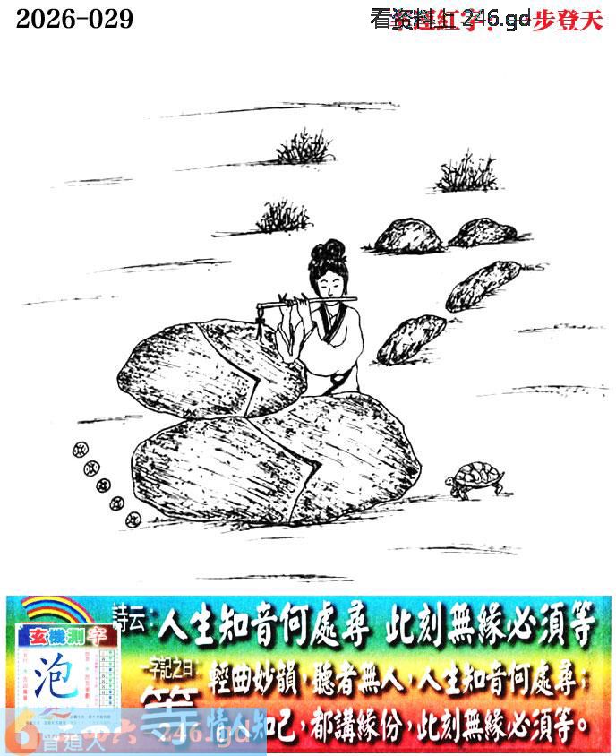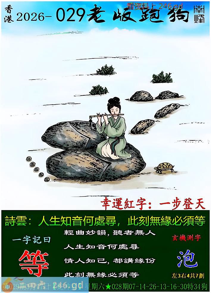 029期老版跑狗一字記之曰:【等】 詩雲:人生知音何處尋,此刻無緣必須等。 輕曲妙韻,聽者無人,人生知音何處尋; 情人知己,都講緣份,此刻無緣必須等。 玄機測字:《泡》