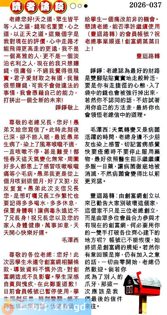 第037期讀者論談 1.老總您好!天之道,眾生皆平等,人之道,和名重要,心之道,以正天之道。這幾個字是我對現在的評價,心中走路才能飛得更高走的更遠,我不是一個高雅的人,更不是一個淡泊名利之人,現在的我只想賺錢,很庸俗,不過我覺得很現實。君子愛財取之有道,我雖很想賺錢,可我不會做違法的事情,我會憑藉自己的能力打拼出一個全新的未來!錚錚敬上 〖錚錚〗:老總認為最好的財路是雙腳貼貼實實地走般幹活,要是你有走捷徑的心態,入了袋中的錢也會被強行掉出來,若然你不認同的話,不妨試著用你自己的方法走,最終你也會領悟老總信中的道理。 2.尊敬的老總兄長,您好!愚弟又給您寫信了。此時此刻夜已深,卻不能入眠,最近愚弟生病了,染上了風寒喉嚨不適,一直咳嗽不停,甚是難受!都怪春天這天氣變化無常,周好多人都患上了感冒咳嗽喉嚨痛等小毛病。愚弟我更是從上個月咳到這個月,好了又犯,反反复复。愚弟此次支信兄長您,是想叮囑兄長工作繁忙也要記得多多喝水,多多休息,保重身體啊!讓病毒永遠近不了兄長身!祝兄長您以及您的家人身體健康,萬事如意,天天開心快樂好運。毛澤西 〖毛澤西〗:天氣轉變又是病菌活躍的時間,老總身邊不少朋友也染上感冒,切記當病感覺快要痊癫時不要停止服用藥物,最好依照醫生指示繼繼續多服一日藥,讓病菌徹底地被消滅,不然病菌會變得比以前更兕猛。 3.尊敬的各位老總:您好!此次因學生未遵守創富網相關條款,導致資料不慎外流,對創富網造成不良影響。學生深感自責與愧疚,在此鄭重道歉!目前會員帳號已暫停使用,生深刻反思、時刻警醒,絕不再出現此類問題。伏望海涵,給生一個痛改前非的機會。懇請老總,能否準許繼續使用(豐迴路轉)的會員帳號?祝老總事業順遂!創富網蒸蒸日上!豐迴路轉 〖豐迴路轉〗:由創富網創立以來已勸告大家別破壞這個家,這個家不只是三位老總創立,而是由眾多位員合力參與才有現在的創富網,何必要用你的一雙手打破各位齊心建下的地方呢?帳號已不能恢復,始終這是創富網的規矩。若然你有意回頭是岸,仍有加人之意的話,一切由零開始,老總仍然歡迎。倘若你成為了別人的爪牙,那這一次應該是我們最後的信件來往。