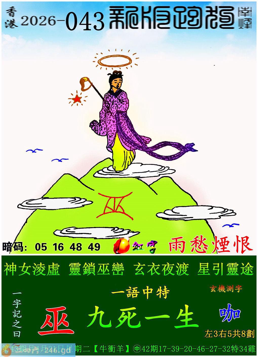 043期跑狗一字記之曰:【巫】 神女淩虛,靈鎖巫巒。 玄衣夜渡,星引靈途。
