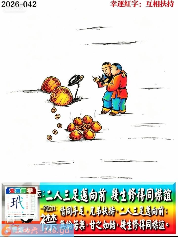 本帖最后由小歪于2026-4-1719:41编辑 2026年4月18日三月初二星期六大海水狗日沖龍 042期:老版跑狗玄机一字記之曰:【襟】 詩云:二人三足邁向前,幾生修得同襟誼。 情同手足,兄弟扶持,二人三足邁向前; 無論苦樂,甘之如飴,幾生修得同襟誼。 玄機測字:《玳》 密圖詩:酒足飯飽去按摩 記:同桌對坐賽象棋 特碼大小單雙句:一窩鳥蛋有六個 今期必中:趙雲 042期:特碼歇后語 懒汉过年-----一年不如一年 042期正版四字梅花诗:瞬息万变。 042期火车头:烧伤兔。诗:羊死猴伤,半岭天风一九三。 042期香港第一手欲钱料:添砖加瓦? 042期曾道人说:“要钱去找1995年第35期开奖结果?” 搬砖 042期另版四字梅花诗:大年初三。 042期香港第一手欲钱料:欲钱看今年元旦的日子。 042期曾道人说:“为什么新年大家都要放鞭炮”? 042期:二字经:绿红。 042期:太太是特码 042期智力金壤:洗耳恭听 042期信箱紅字:【生發未燥】 042期暗码:【05164849】 042期一語中特:【五光十色】 發財玄機圖:口吐烈焰威猛迅捷圖中明龍紅綠 042期:藏寶圖 新:曾捧瀛洲札翰来 老:白草黄榆陆拾秋 禁:鸡禁:0尾玄机字《嘉》 2026年042期【生活幽默】版 〖郁悶的小伙子〗 在飛機上,一個小伙子和一位老人并排坐着。小伙子:"請問,現在幾點鐘?" 老年人:"我不能告訴你,我要是告訴你現在幾點鐘,你就會向我表示感謝。這樣,話匣子一打開,就不容易收場了。再過一會兒,我們就會一道下飛機。在機場上,你又會請我進咖啡館,我也會請你到我家去做客,我家裹有一個小女兒,她長得很漂亮。于是你就會愛上了她,她也會爱上你,于是你們就會决定结婚。可是,你要知道,我决不會把女兒嫁給一個連手表都没有的窮光蛋。"