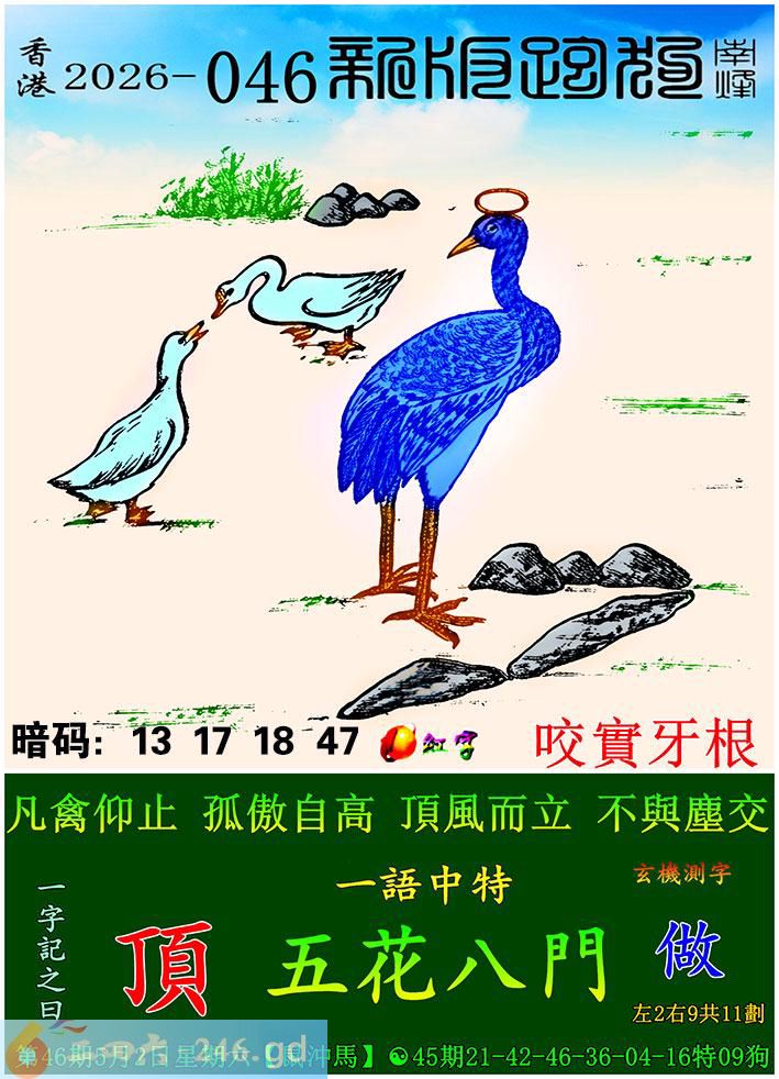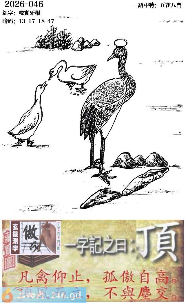 046期跑狗一字記之曰:【頂】 凡禽仰止,孤傲自高。 頂風而立,不與塵交。