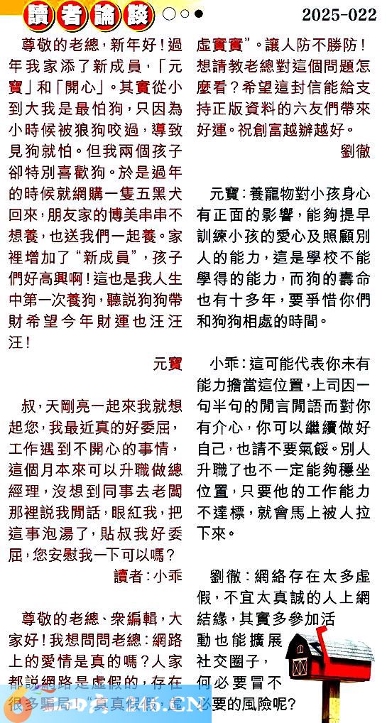 第零二二期讀者論談 1.尊敬的老總,新年好!過年我家添了新成員,「元寶」和「開心」。其實從小到大我是最怕狗,只因為小時候被狼狗咬過,導致見狗就怕。但我兩個孩子卻特別喜歡狗。於是過年的時候就網購一隻五黑犬回來,朋友家的博美串串不想養,也送我們一起養。家裡增加了“新成員”,孩子們好高興啊!這也是我人生中第一次養狗,聽說狗狗帶財希望今年財運也汪汪汪!元寶 〖元寶〗:養寵物對小孩身心有正面的影響,能夠提早訓練小孩的愛心及照顧別人的能力,這是學校不能學得的能力,而狗的壽命也有十多年,要爭惜你們和狗狗相處的時間。 2.叔,天剛亮一起來我就想起您,我最近真的好委屈工作遇到不開心的事情,這個月本來可以升職做總經理,沒想到同事去老闆那裡說我閒話,眼紅我,把這事泡湯了,貼叔我好委屈,您安慰我一下可以嗎?讀者:小乖 〖小乖〗:這可能代表你未有能力擔當這位置,上司因一句半句的閒言閒語而對你有介心,你可以繼續做好自己,也請不要氣餒。別人升職了也不一定能夠穩坐位置,只要他的工作能力不達標,就會馬上被人拉下來。 3.尊敬的老總、案編輯,大家好!我想問問老總:網路上的愛情是真的嗎?人家都說網路是虚假的,存在很多騙局!“真真假假,虛虚實實”。讓人防不勝防!想請教老總對這個問題怎麼看?希望這封信能給支持正版資料的六友們帶來好運。祝創富越辦越好。劉徹 〖劉徹〗:網絡存在太多虛假,不宜太真誠的人上網結緣,其實多參加活動也能擴展社交圈子,何必要冒不必要的風險呢?